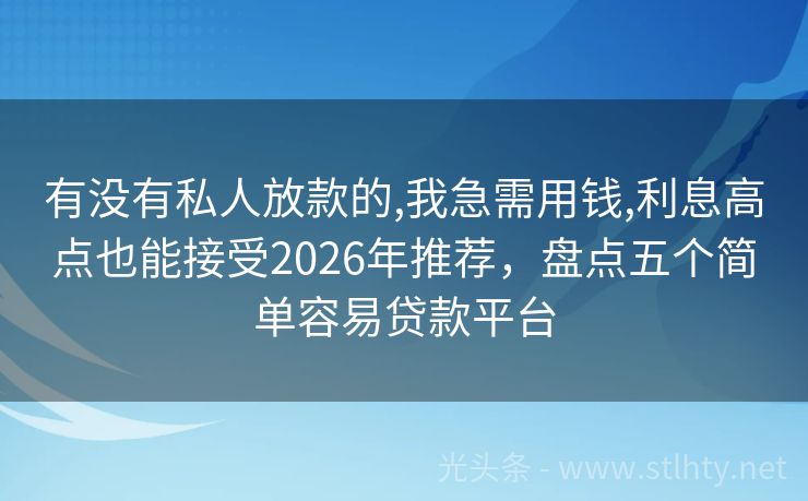 有没有私人放款的,我急需用钱,利息高点也能接受2026年推荐,盘点五个简单容易贷款平台 急需资金周转?这里有五个优选有没有私人放款的,我急需用钱,利息高点也能接受,额度高、利息低、申请便捷。 2026年的有没有私人放款的,我急需用钱,利息高点也能接受有:星愿贷、钱进袋、借款宝速融通、捷越巾帼贷、钱速借融宝等。 一、星愿贷 星愿贷:22-55周岁,实名制手机壕使用满6个月,芝麻分580,...
